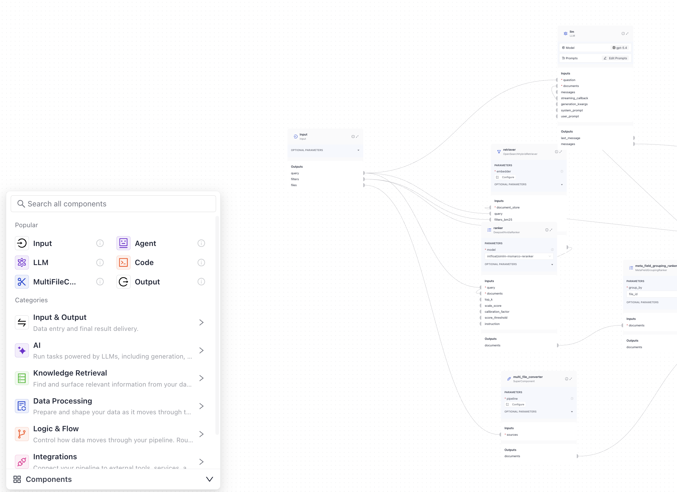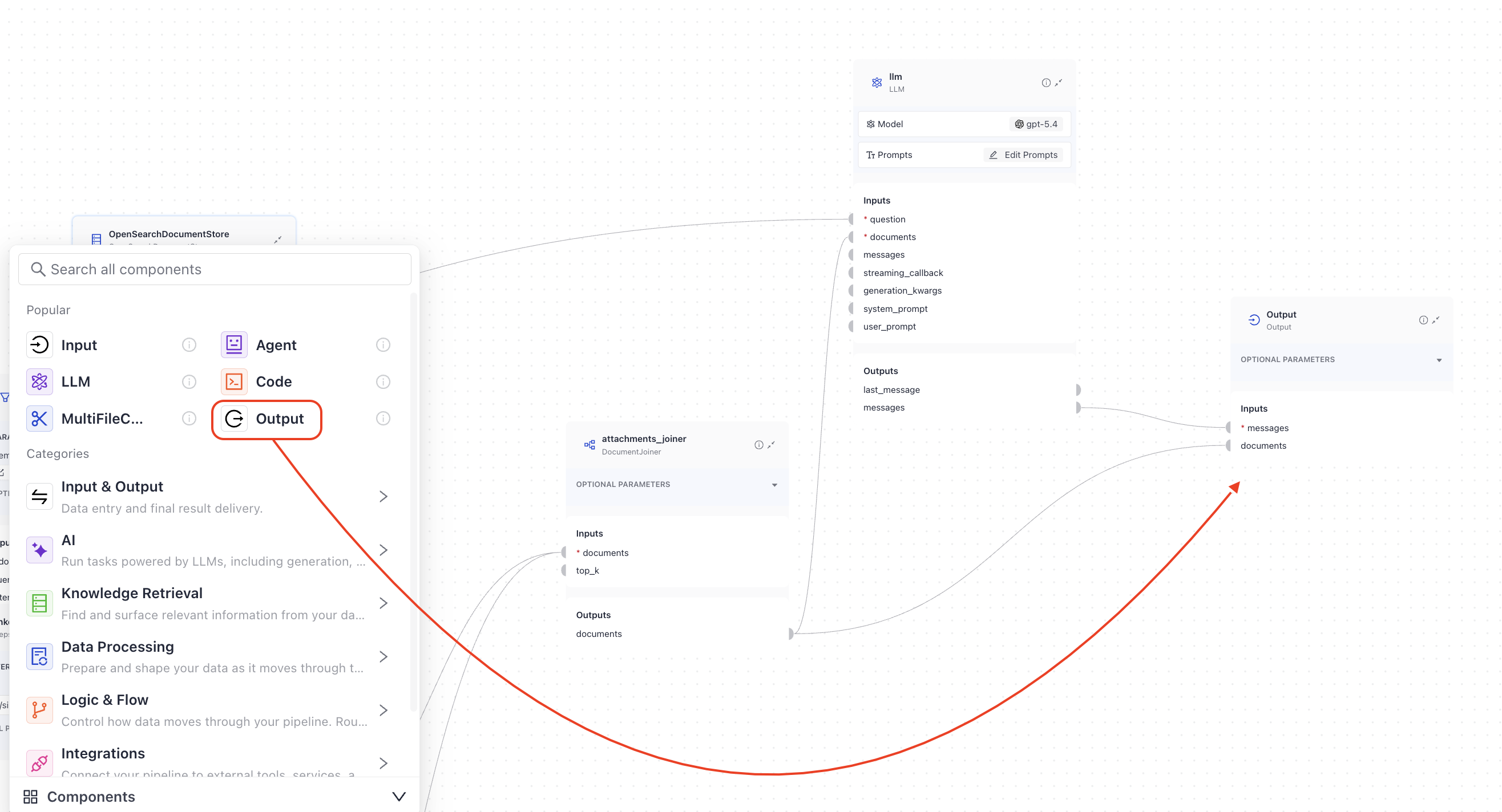 In Builder, to finalize the pipeline with the correct output, drag the Output component onto the canvas and connect it to the components that produce the documents or answers you want to include: