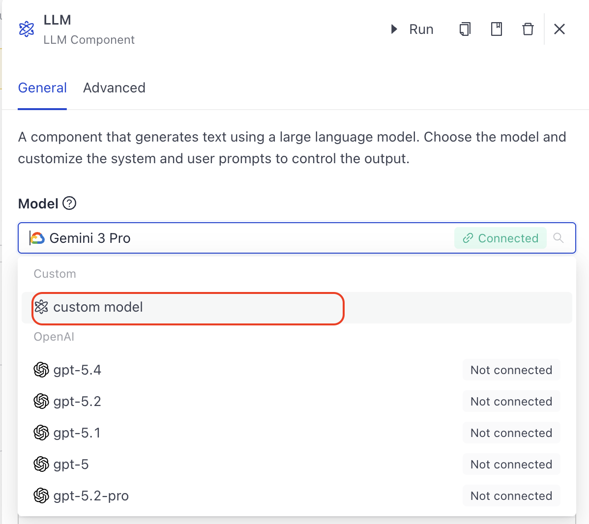 After you save a custom model, it appears in the list of available models on component cards that support models, such as LLM or Agent.