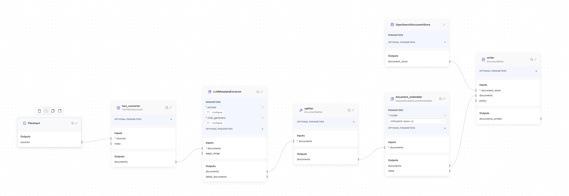 Once your data is in deepset, you can create an index that will be the starting point for the auto-labelling system. The index prepares files for search and writes them into a document store, where a query pipeline can then access them.