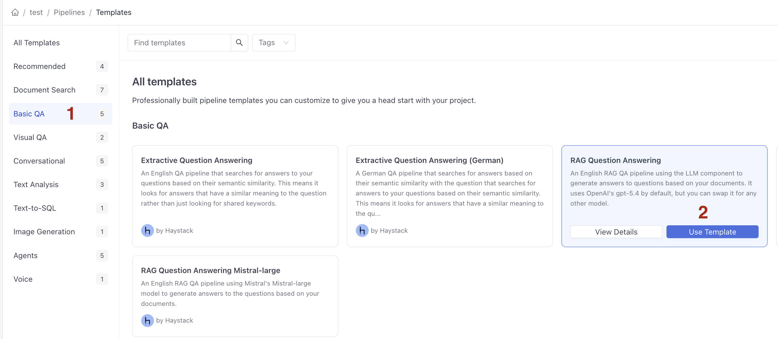 - Choose Basic QA, find RAG Question Answering, hover your mouse over the template and click Use Template.