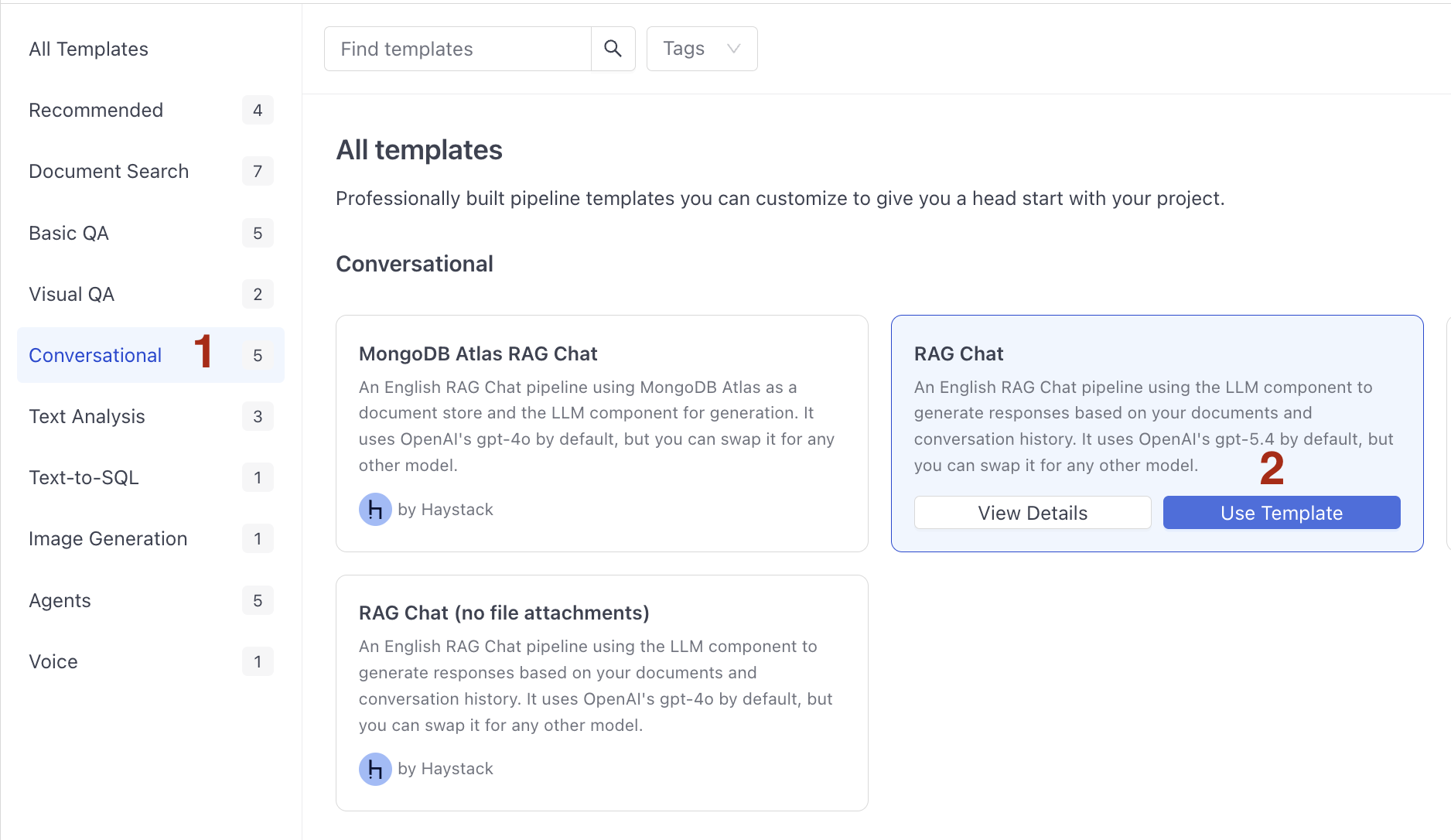 Choose Conversational templates, hover over RAG Chat, and click Use Template.