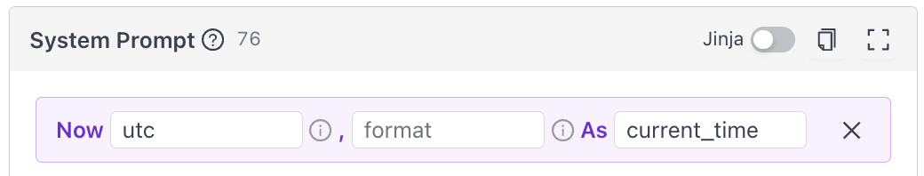 The system prompt supports dynamic content through Jinja2 syntax and a rich Jinja2 editor that makes it easier to insert variables and function.