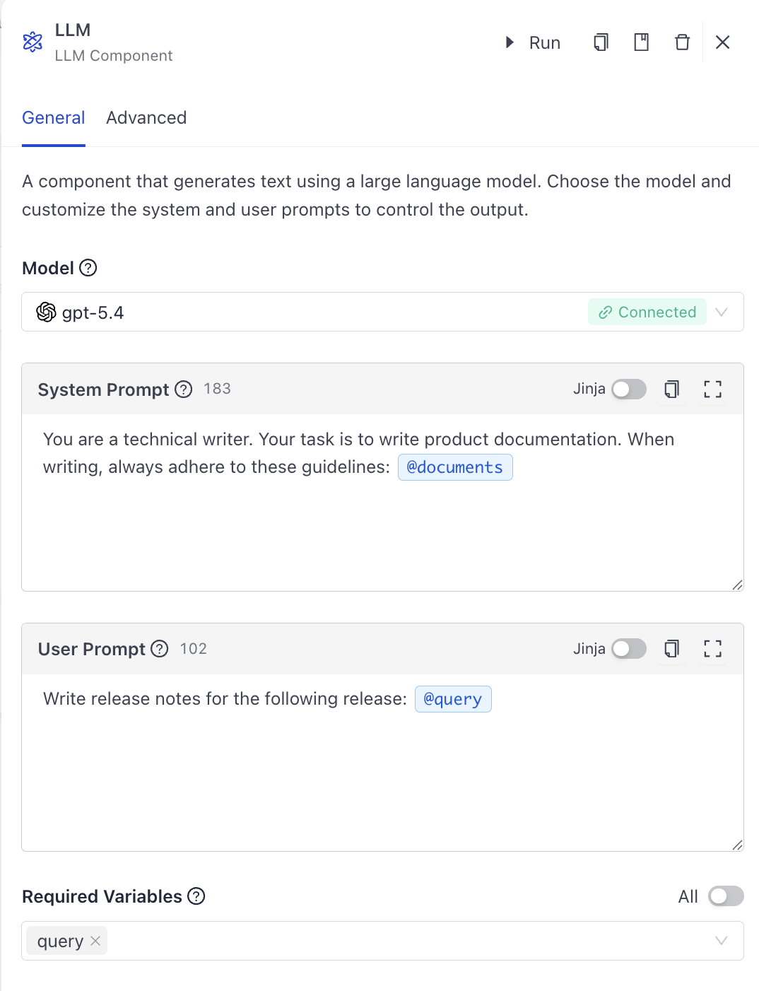When using the LLM, you can pass the system and user prompts directly in the component configuration. You can also use Jinja2 syntax to insert variables into the prompt.