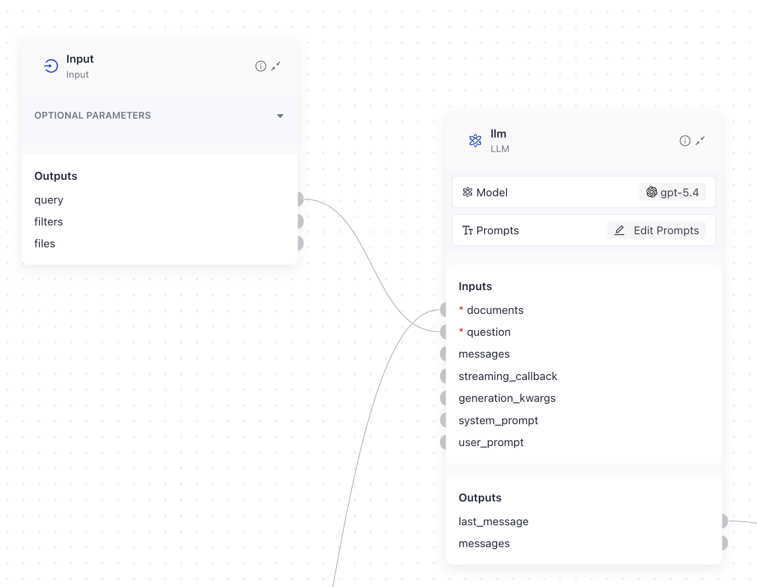 Similarly, it can receive the documents variable if the Retriever component's documents output is connected to the LLM's documents input.